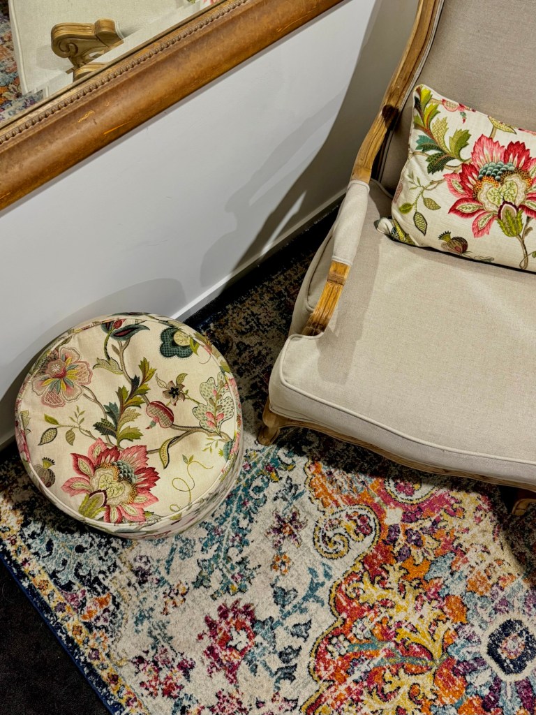 Mum had the lampshade and cushions custom-made with ‘Malmsbury Willow’ fabric from Warwick Fabrics. Pink and neutrals quickly became the colour theme for this space, which we continued with further design choices, including the rug from Temple & Webster.